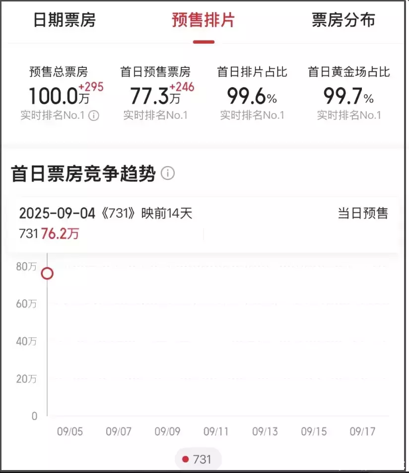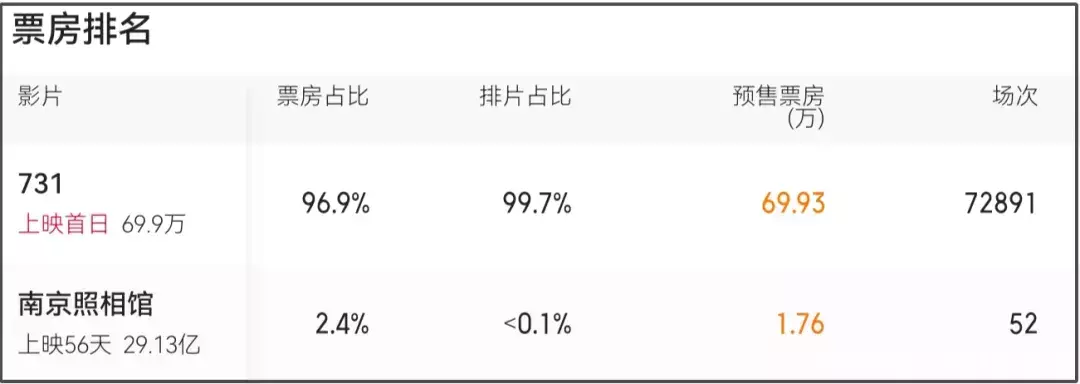 就《731》首日排片占比看,东谈主家业内莫得说空论,预售一开就给《731》猛上排片,占比超99%。