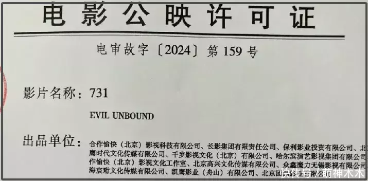 如今细看《731》公映许可,会发现影片排次号是2024年,意味着《731》在2024年才定下最终版块,2025年9月拿到公映许可,才不错定档9月18日沉着上映,过程平常、手续王人全。