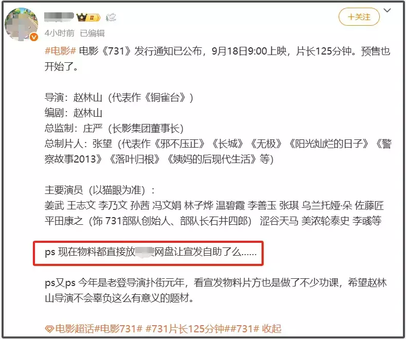 除了迟迟不宣发,还有博主显现,《731》连物料都放在网盘,宣发纯靠自助,发不发、奈何发、奈何发成果更好,片方少量没管,都是业内自行安排。