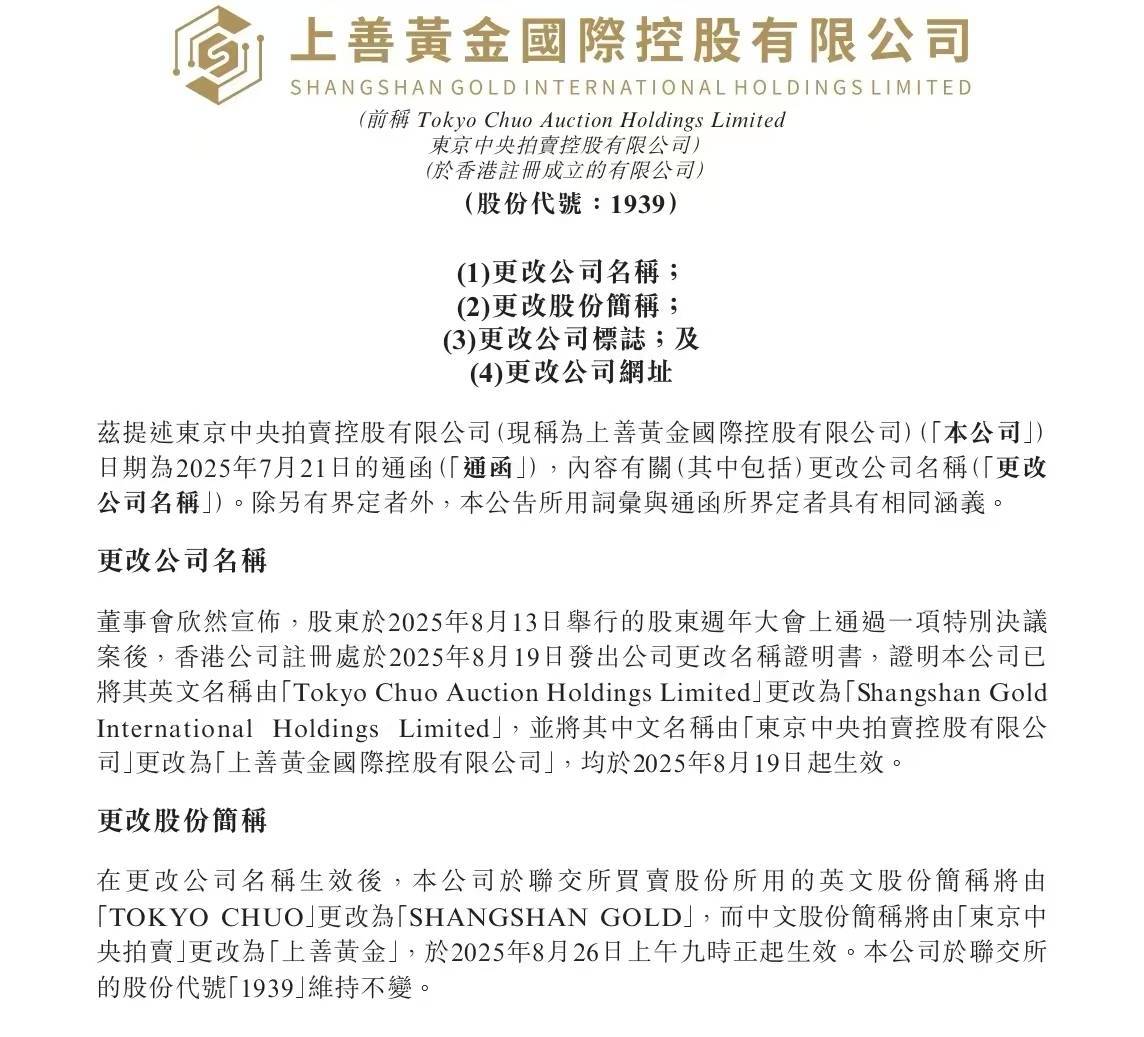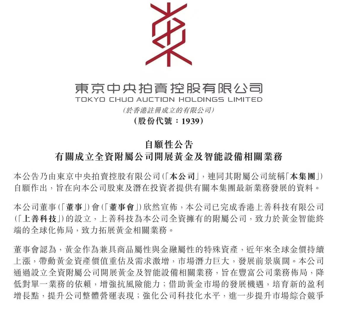 值得热心的是,本年5月,金雅福集团董事长黄仕坤实控的ESSA FINANCIAL迥殊一致行为东谈主,着手收购了香港主板上市公司东京中央拍卖75%的股权,黄仕坤董事长趁势成为东京中央拍卖的本体胁制东谈主。8月15日,京东中央拍卖公告已完成香港上善科技有限公司果真立,后者看成其全资领有的附庸公司,接力于黄金智能末端的各人化布局,拓展黄金有关业务。公司公告称,此举旨在丰富业务佈局,增强抗风险智商,借助黄金市场的发展机遇,训导新的盈利增长点;强化公司科技化水平,进一步提高市场概括竞争力;同期借助香港的区位及国际化上风,拓展各人市场。8月22日东京中央拍卖改名为“上善黄金国际控股有限公司”。