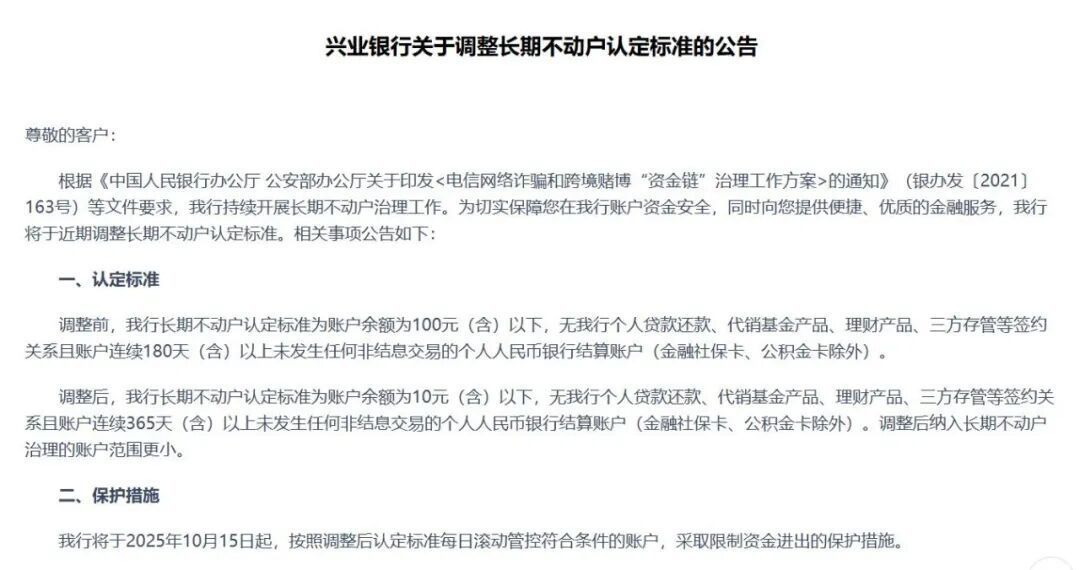 记者珍贵到,以兴业银活动例,10月15日起,该即将逐日治疗管控安妥条目的账户。新法式章程:账户余额10元以下,通顺一年无交游,且未绑定贷款、快乐或三方存管业务的个东谈主结算账户,将被纳入处理限制。其中,社保卡、公积金卡之外。